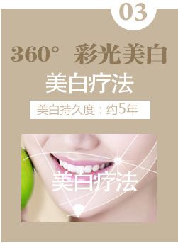 "彩光美白"结合智能激活能量美牙理念,在冷光美白的基础上,首创过氧化氢加硝酸钾和氟化物结合的美白方式,克服了传统冷光美白时牙齿酸痛,美白后牙龈过敏的窘境,15分钟产生美白作用,30分钟告别黑牙、黄牙、色素牙。