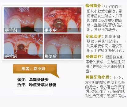 | 手术亮点 | 微创即刻种植技术针对牙槽骨情况好的患者可以即刻种植即刻修复,就是种完马上有牙齿,马上安装牙冠,而不需要像传统种植牙埋入3个月后割开做二期修复,二期修复2个星期后拆线,拆完线再等一个星期才能带牙。解决了大部分患者对种植牙等待时间的疑虑问题。 | |